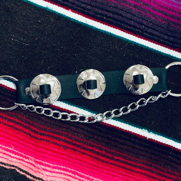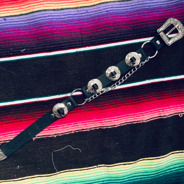 Handcrafted 100% Oil Tanned Kodiak Black leather or Buffalo Sapphire leather 1" boot straps connected with metal rivets, nickel-free silver hardware, 1" conchos and western buckle.