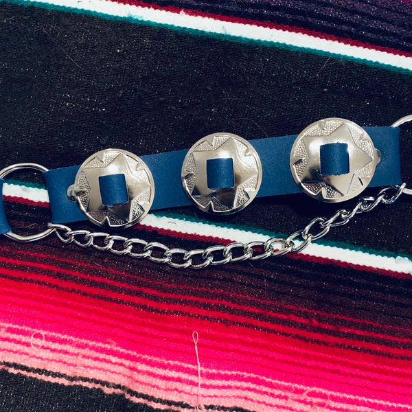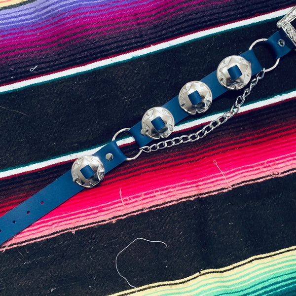 Handcrafted 100% Oil Tanned Kodiak Black leather or Buffalo Sapphire leather 1" boot straps connected with metal rivets, nickel-free silver hardware, 1.5" conchos and western buckle.