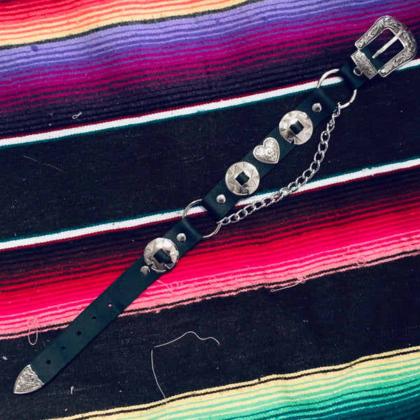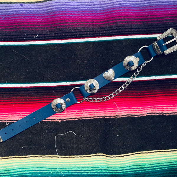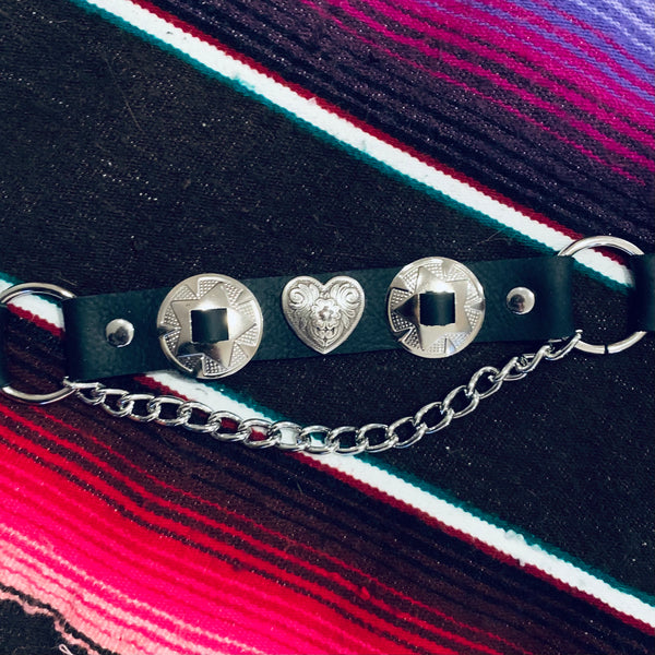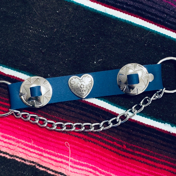 Handcrafted 100% Oil Tanned Kodiak Black leather or Buffalo Sapphire leather 1" boot straps connected with metal rivets, with silver hardware, Heart Shaped and classic conchos and western buckle.