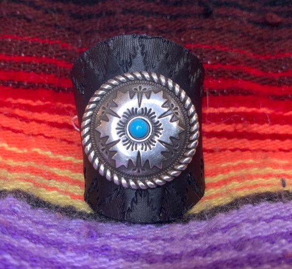 Desert Flower Bandana Slide is 100% vegtan leather, hand stamped, dyed and tooled, snap closure at back.